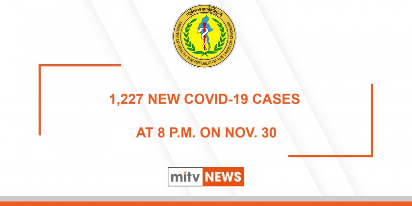 Ministry of Health and Sports at 8 p.m. on Monday reported 1,227 new COVID-19 cases after testing 15,935 lab specimens. 23 COVID-19 patients lost their lives due to the disease while 1,246 patients have been discharged from hospitals. COVID-19 cases in Myanmar had reached 90,713 with 1,941 deaths at 8 p.m. on the 30th of November, and 70,156 COVID-19 patients have been discharged so far.