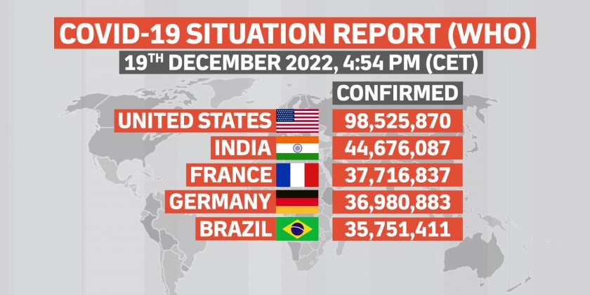 The World’s worst-hit countries are the United States of America, India, France, Germany, Brazil, the Republic of Korea, Japan, Italy, the United Kingdom and the Russian Federation, according to the World Health Organization. Globally, as of 4:54pm CET, 19 December 2022, there have been over 649 million confirmed cases of COVID-19, including over 6.64 million deaths.