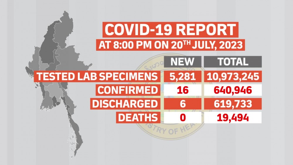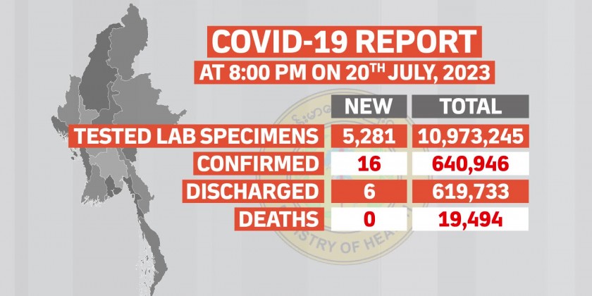 At the time of report, there is no patient who died due to the disease while 6 patients have recovered from the disease. Confirmed cases of COVID-19 in Myanmar reached 640,946 and the death toll stands at 19,494 and the number of recovered patients is 619,733.
