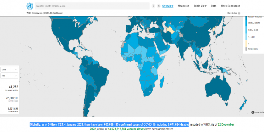 The World’s worst-hit countries are the United States of America, India, France, Germany, Brazil, the Republic of Korea, Japan, Italy, the United Kingdom and the Russian Federation, according to the World Health Organization. Globally, as of 5:09pm CET, 4 January 2023, there have been over 655 million confirmed cases of COVID-19, including over 6.67 million deaths.
