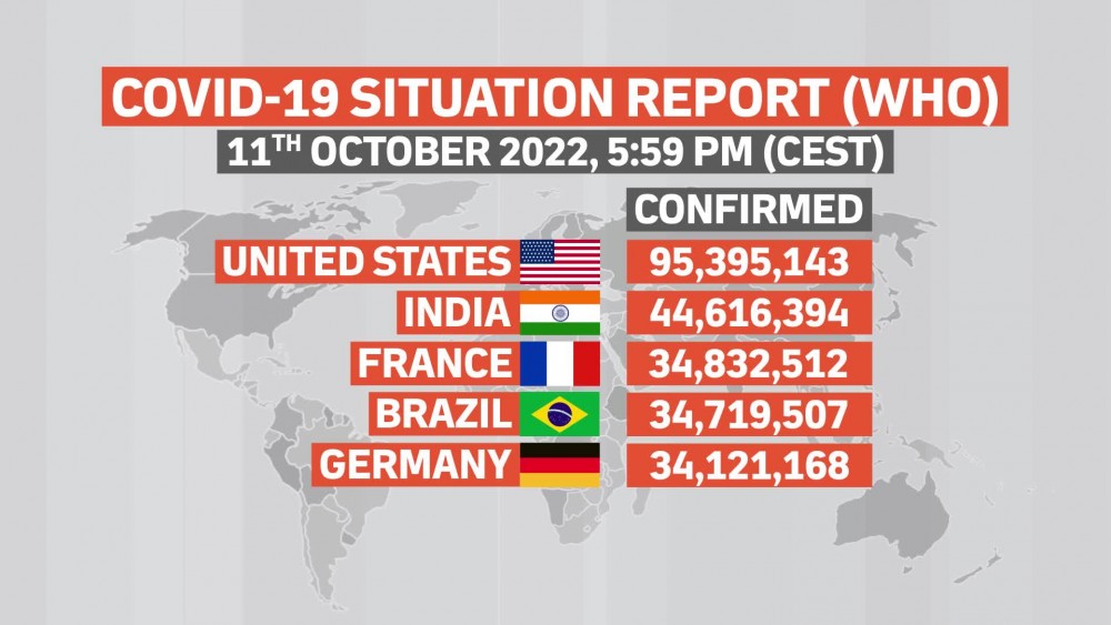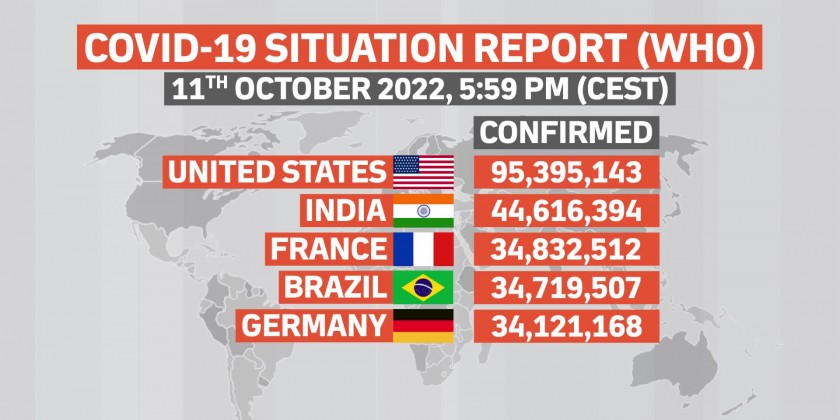 The World’s worst-hit countries are the United States of America, India, France, Brazil, Germany, the Republic of Korea, the United Kingdom, Italy, Japan and Russian Federation, according to the World Health Organization. Globally, as of 5:59pm CEST, 11 October 2022, there have been over 619 million confirmed cases of COVID-19, including over 6.53 million deaths.