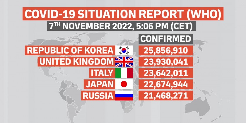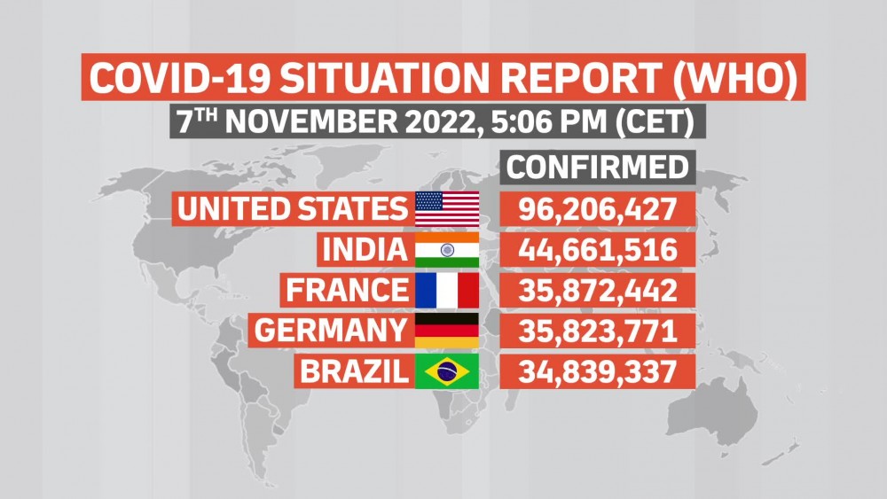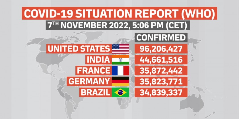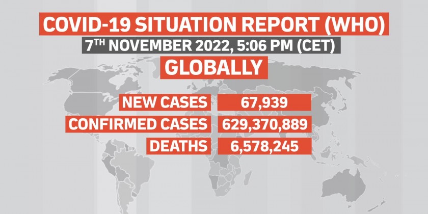 Globally, as of 5:06pm CET, 7 November 2022, there have been over 629 million confirmed cases of COVID-19, including over 6.57 million deaths.