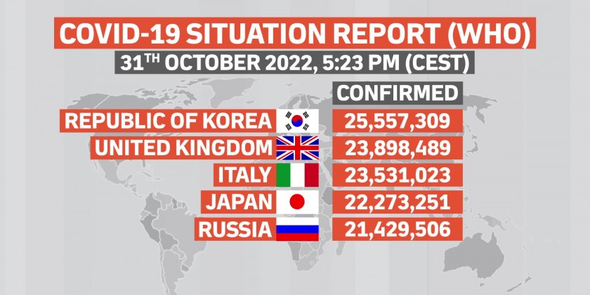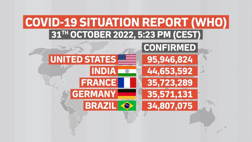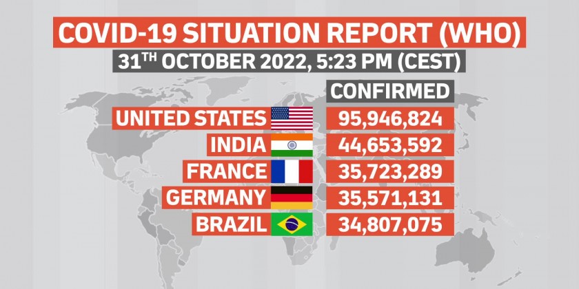 The World’s worst-hit countries are the United States of America, India, France, Germany, Brazil, the Republic of Korea, the United Kingdom, Italy, Japan and Russian Federation, according to the World Health Organization. Globally, as of 5:23pm CET, 31st October 2022, there have been over 627 million confirmed cases of COVID-19, including over 6.56 million deaths.