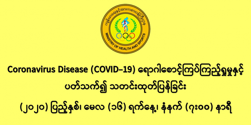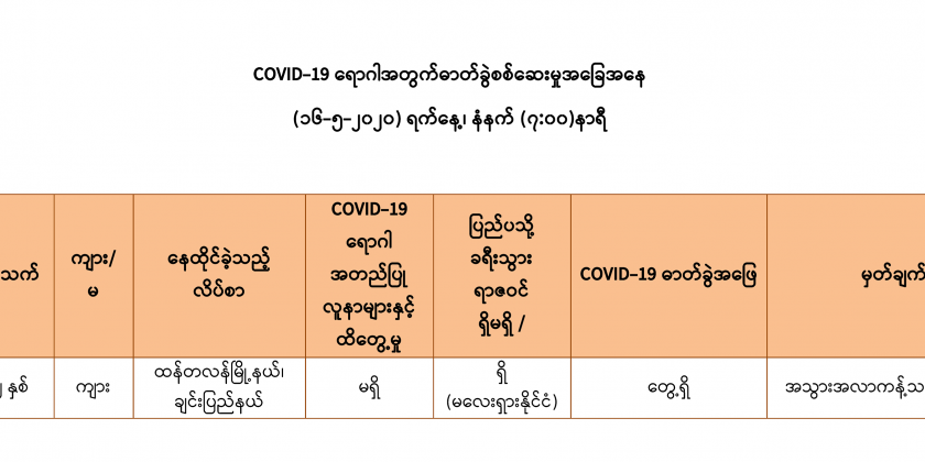 One new case of COVID-19 found on 16th May as a lab results of the National Health Laboratory (Yangon).