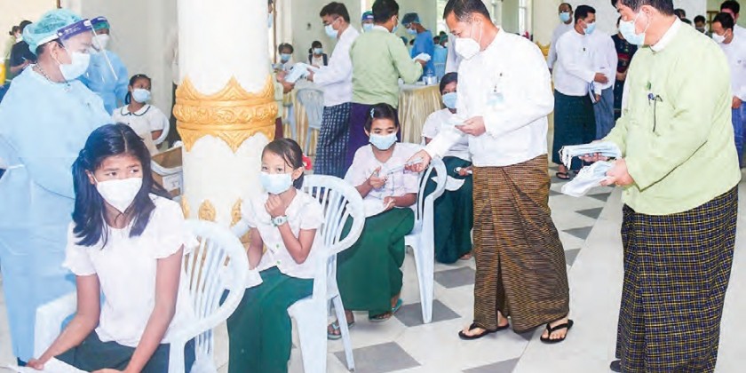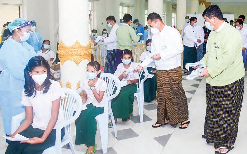 They also viewed the distribution of masks to the students free of charge and inspected the QR Code system for those fully vaccinated. The government made a plan to vaccinate 11,556 students aged 12 and above against the COVID-19 disease at Mingala Byuhar hall starting from October 12, and 3,814 students received their vaccines until October 23.