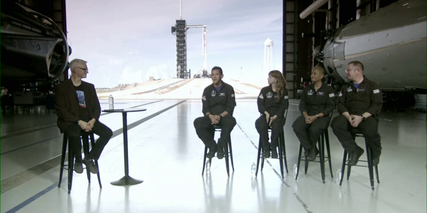 The crew held a press conference at the Kennedy Space Center on Tuesday, a day before launch. For the first time in 60 years of human spaceflight, a rocket is poised to blast into orbit with no professional astronauts on board, only four tourists. SpaceX's first private flight will be led by a 38-year-old entrepreneur who's bankrolling the entire trip.
