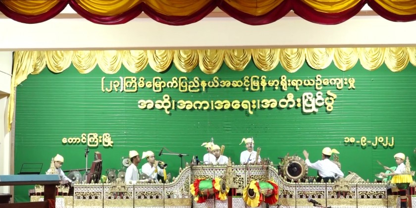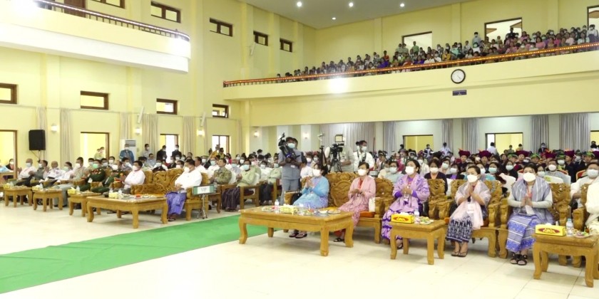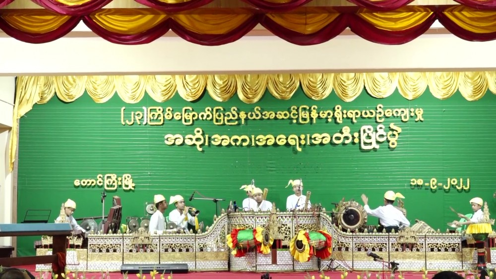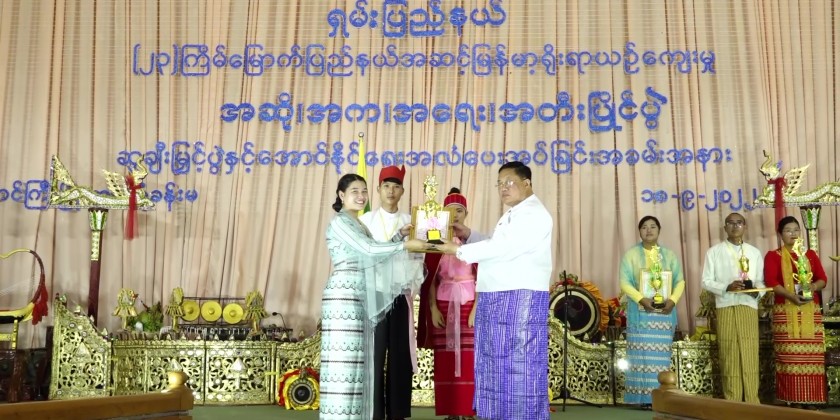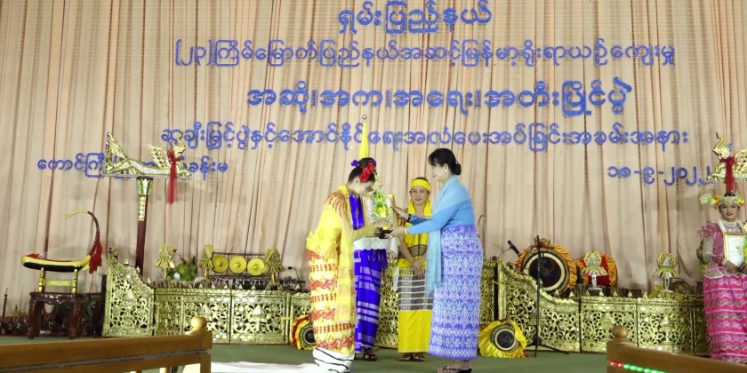 Shan State Chief Minister Dr Kyaw Tun together with officials observed competing of contestants at the State Level Cultural Performing Arts Competition in Keng Tung hall in Taunggyi University on Sunday and the Chief Minister presented cash to Htet Eain Gu (ထပ်အိမ်ဂူ) orchestra Saing troupe.