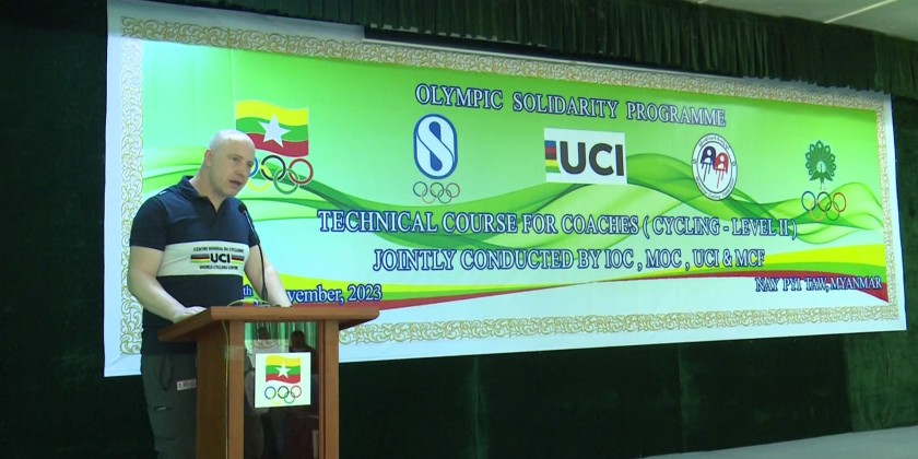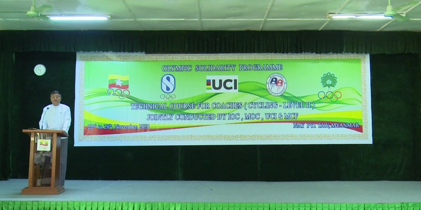 The opening ceremony of bicycle coach (Grade-2) training organized under the program of International Olympic Committee for the improvement of Myanmar bicycle sport standard was held at Multipurpose Hall of Gold Camp in Nay Pyi Taw in the morning on 22nd November with the attendance of the Chairman of Myanmar Olympic Committee Union Minister for Sports and Youth Affairs U Min Thein Zan, Chairman of Myanmar Cycling Federation, instructor Dr. Chester Alexander Hill, officials concerned and the trainees.