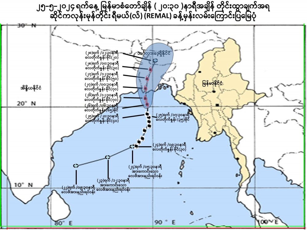 It is centered at about (285) Nautical miles West-Northwest of Thandwe, (200) Nautical miles West-Southwest of Sittwe (Myanmar), (160) Nautical miles South-Southwest of Khepupara (Bangladesh), (160) Nautical miles South-Southeast of Sagar Island and (180) Nautical miles South- Southeast of Canning (West Bangal, India). It has not directed towards Myanmar Coasts, the present stage of the Cyclonic Storm “REMAL” is coded yellow stage.