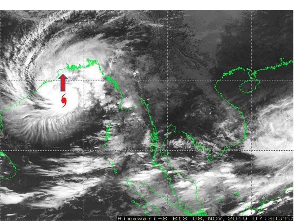 According to the observations at (12:30)hrs Myanmar Standard Time on Friday, the Very Severe Cyclonic Storm "BULBUL" over the West-central Bay and adjoining East-central Bay of Bengal moved North-Northwestwards is centered at about (195) nautical miles South-Southeast of Paradip (Odisha), India, (270) nautical miles South -Southwest of Sagar Islands (West Bengal)၊ (320) nautical miles South-Southwest of Khepupara (Bangladesh), (350) nautical miles Southwest of Sittwe (Myanmar) and (350) nautical miles Southwest of Maungdaw (Myanmar).