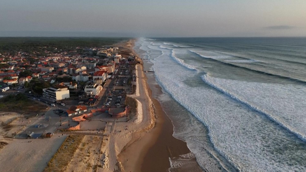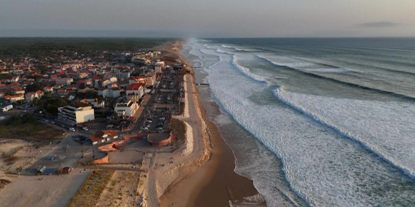 Images of powerful waves crashing onto the coast at Lacanau, in Gironde, as an unusual swell for the summer season sweeps across the Atlantic coastline, with waves reaching heights of 4 to 5 meters, according to Meteo-France.