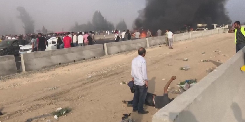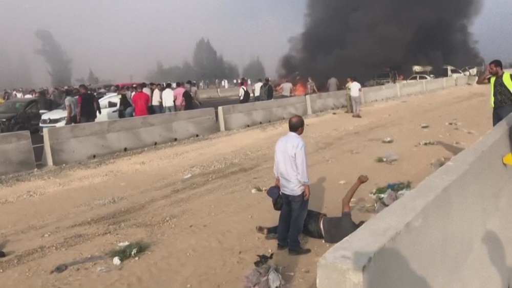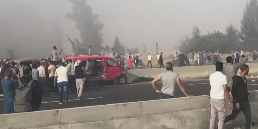 At least 35 people were killed and more than 50 others injured Saturday in a horrific collision on an Egyptian highway involving a bus and several cars. An over turned lorry lying across the fast lane on burning tarmac. Further, at least one bus and a minibus, both largely on fire, as well as many cars, some still in flames.