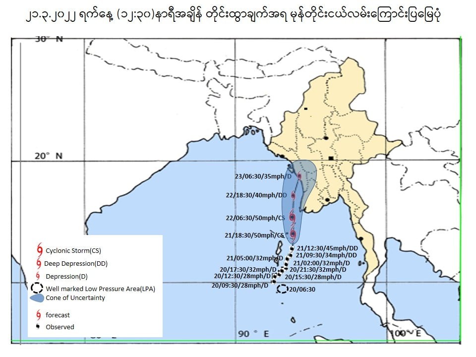 It will move towards Myanmar coasts, the present stage of the de­pression is coded orange stage. Center pressure of depression is (1002) hPa and maximum wind speed near the center is 45 miles per hour.