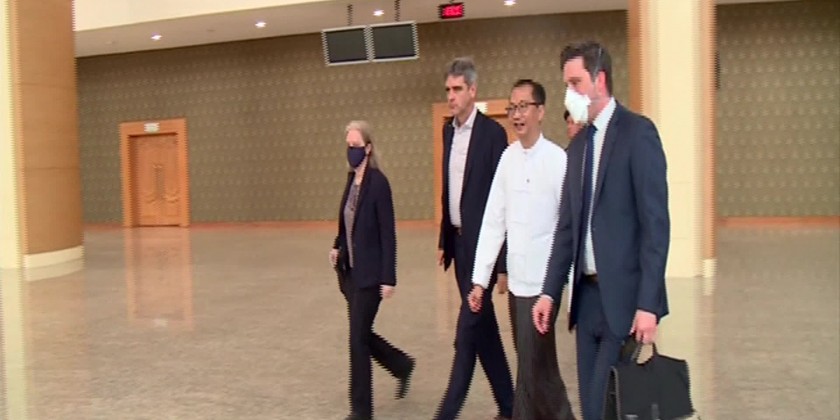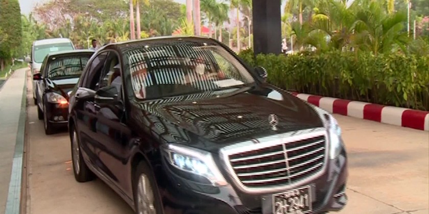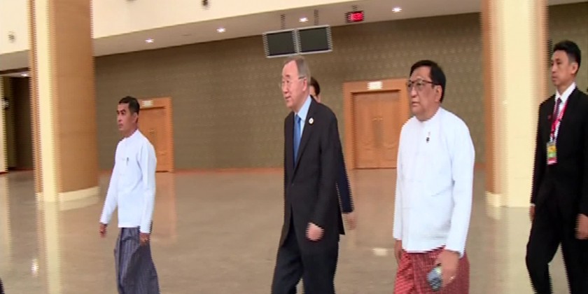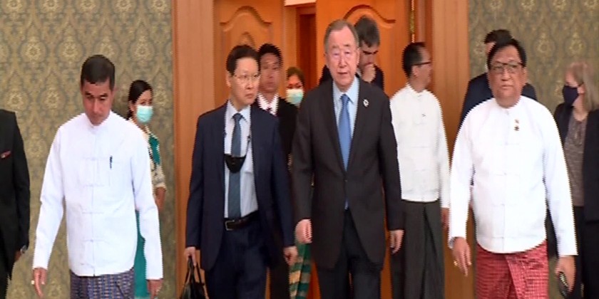 A delegation led by the Vice Chair of The Elders Former UN Secretary-General Ban Ki-moon arrived at Nay Pyi Taw by air in the evening on 23rd April. The delegation led by the Vice Chair of The Elders was greeted by the deputy minister for defense Ma-J Gen. Aung Lin Tun, deputy minister for foreign affairs U Kyaw Myo Htut and officials at Nay Pyi Taw International Airport.
