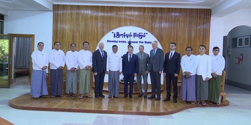 Union Minister for Commerce U Chit Swe received a delegation led by Mr. Sergey Shatirov, the Honorary Consul of the Republic of the Union of Myanmar in Krasnogarsk with a Consular Zone including the Moscow Region, Supervisory Board Member of the Roscongress Foundation and Coordinator of the Projects in Southeast Asia of the Fund RC-Investments at Meeting Hall No. 1, Office No. 3, Ministry of Commerce, Nay Pyi Taw, on December 4.