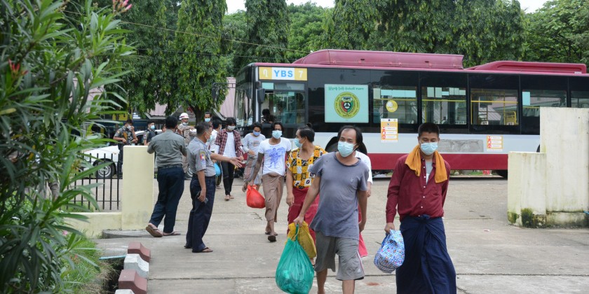 Then, the released detainees were sent back to their respective townships by YBS vehicles. A total of 721 detainees included 590 males and 131 females detained at Insein Central Prison under Section 505 (a) of the Penal Code were released.