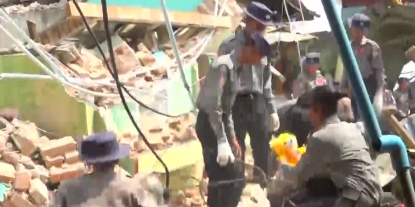 Members of the Myanmar Police Force, along with volunteer organizations from Sagaing, conducted cleanup operations following the recent devastation.