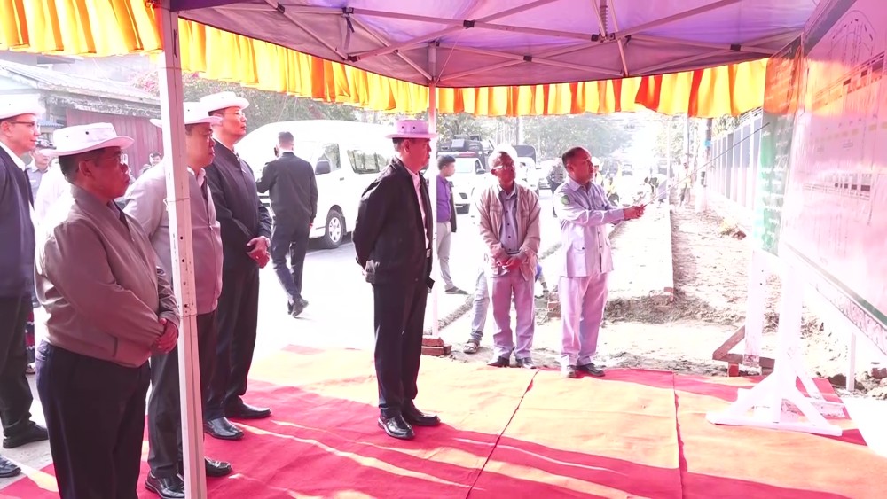 They oversaw road drainage, pavement, and box culvert construction works on Minbargyi Road, funded under the 2025–2026 fiscal year capital budget. Later, the Chief Minister inspected asphalt paving, drainage works, and parking areas near the Sittwe Airport rest house. He instructed officials to ensure good quality work, and emphasized environmental cleanliness around the airport.
