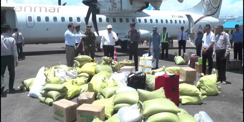 Simultaneously, due to the inability of cargo trucks to travel along the Myitkyina-Sumbrabon-PutaO road section because of regional circumstances, food supplies were distributed to service personnel and the local community in PutaO District. The Kachin State Government arranged for these supplies to be delivered by air. The first phase of distribution included essential items such as rice, dried fish, and edible oil.