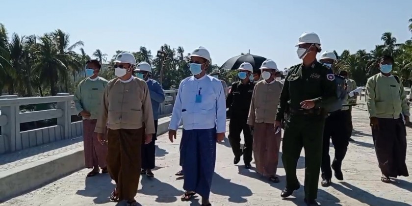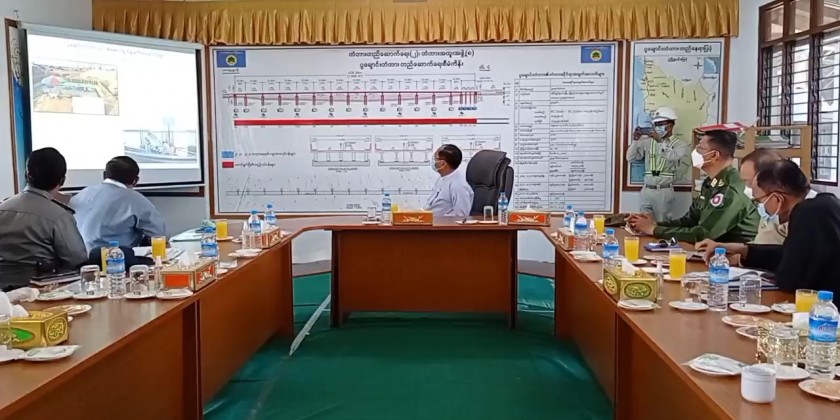 The Chief Minister and party later inspected the construction of Gwa Chaung Bridge on Gwa-KyaukChun Road. After hearing the reports on progress of bridge construction and future plans, the Chief Minister inspected the construction site. Later in the day, the Chief Minister and party met with departmental personnel and local people.
