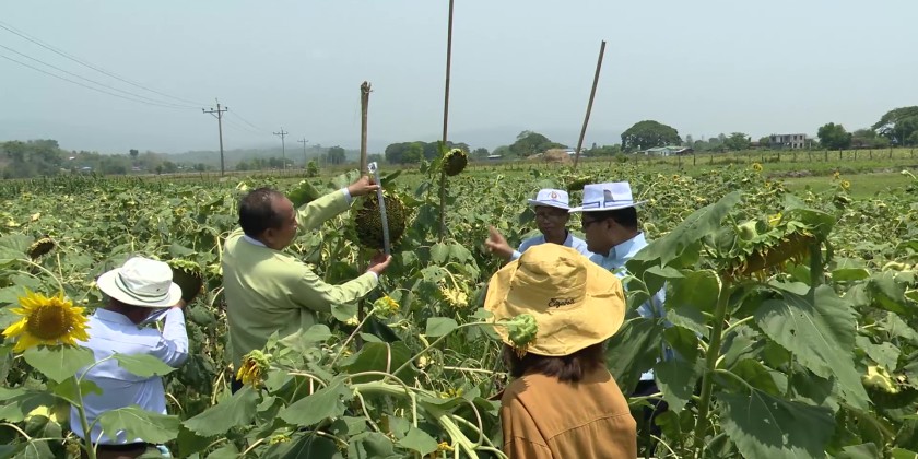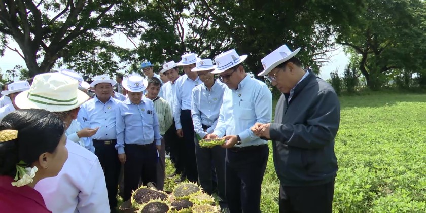 Upon the arrival at TaungNi village tract, they observed the use of Sunn Hemp to improve soil quality and enhance monsoon paddy yields at Kyunkone East field. In the afternoon, the Chief Minister and party inspected home garden vegetable crops and coordinated the needs to provide a solar water system to ensure sufficient water for individual vegetable growers.