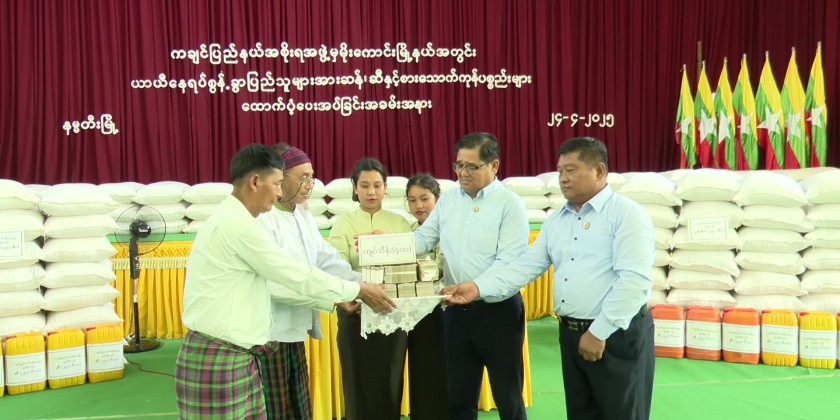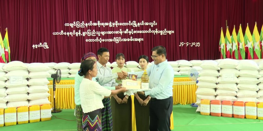 The Chief Minister and party then distributed 234 bags of rice, 234 viss of oil and dried noodles to displaced families of Nyaungtaw and LanKhwa Villages and 400 million kyats for the construction of a concrete bridge in KyaInn (2) Village. The Chief Minister also heard reports of the displaced families and provided 50 million kyats for road construction.