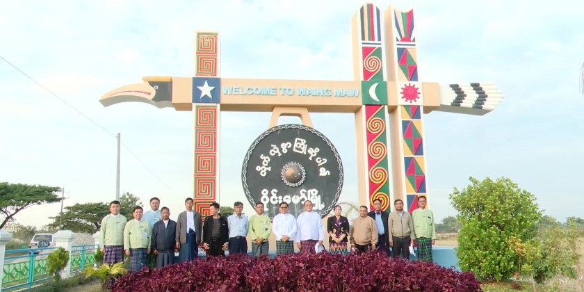During the tour, the Chief Minister viewed the landscaping works at the entrance of Wai Maw Town, cultivation of double cropping in Moat Hlawe Field, building fence and digging solar-powered tube wells.