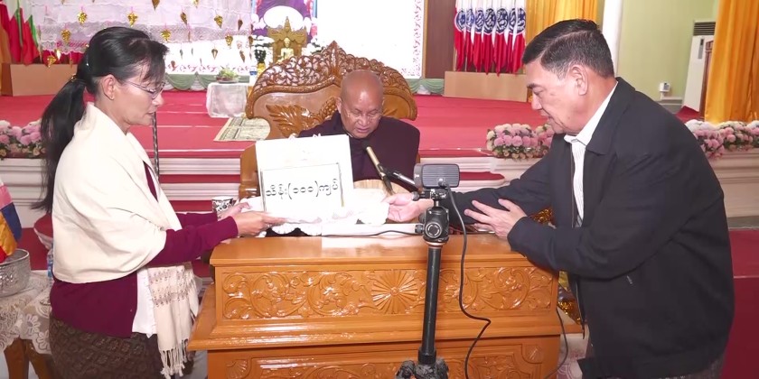 At the ceremony, the State Chief Minister and his wife, along with the guests, received the Five Precepts from the Mrauk-U Sayadaw and listened to the Dhamma discourse delivered by the Sayadaw. They then offered donated items and cash donations.