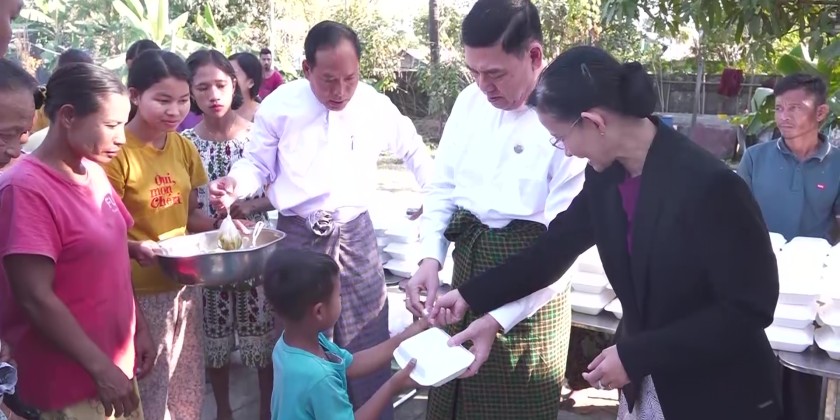 In the evening, the State Chief Minister, his wife, and other members visited and encouraged the charitable act of cooking and offering one month's worth of rice and meat dishes to 10,000 temporarily displaced persons and other needy people in Sittwe, and personally handed out the rice and meat dishes to the public.