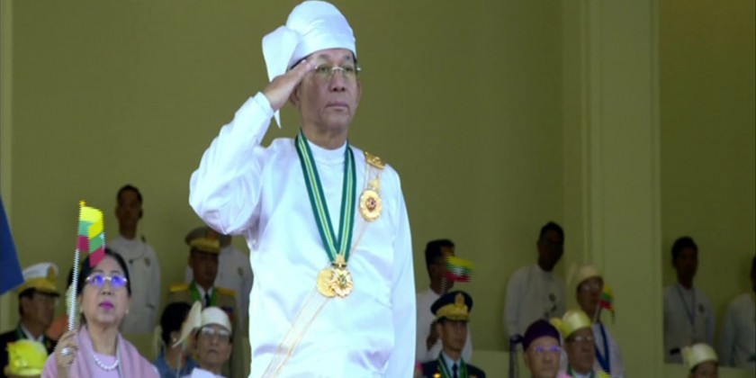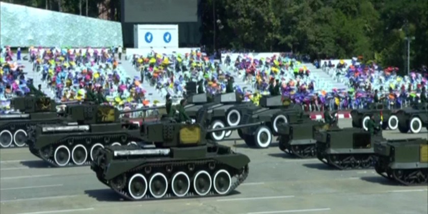 Union ministers and their wives, senior military officers, concerned officials, representatives from ethnic armed organizations, political parties, ethnic people, artists, NGOs and invited guests.The Senior General arrived at parade ground and took his position at the review stand and took the salute of parade columns from the dais. Simultaneously, the Guard of honour accorded a 21-gun salute and 750 peace doves were released in honour of the 75th Diamond Jubilee Independence Day.