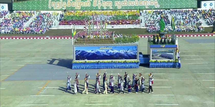 The students from the basic education schools in Nay Pyi Taw council area also performed alphabet presentation and image performance. The parachute team also landed from the air and marched to the ground by carrying flags representing Tatmadaw (Army, Navy and Air), respective regions and states and ministries. While saluting, the Senior General and wife and dignitaries cordially greeted the parade floats, demonstration teams and dance troupes by waving hands. After the ceremony, the Senior General and wife cordially greeted those present and left from the parade ground.