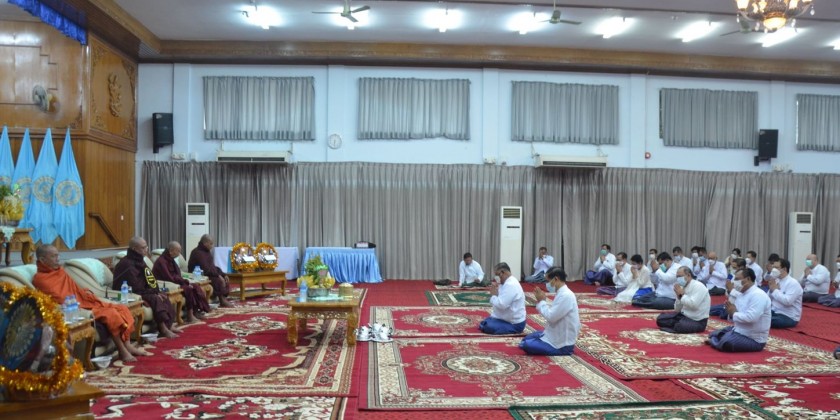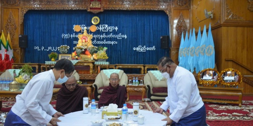 Then, they organized a ceremony to honour Yadana Hman Monastery Sayadaw Bhaddanta Vilasa who received the Saddhamma Jotikadhaja title of the government and donated 20 million Kyats cash contribution of the staff of the Ministry of Foreign Affairs, Ministry of International Cooperation, Myanmar embassies and other staff officers for heavy maintenance works to the main building of Yadana Hman Monastery.