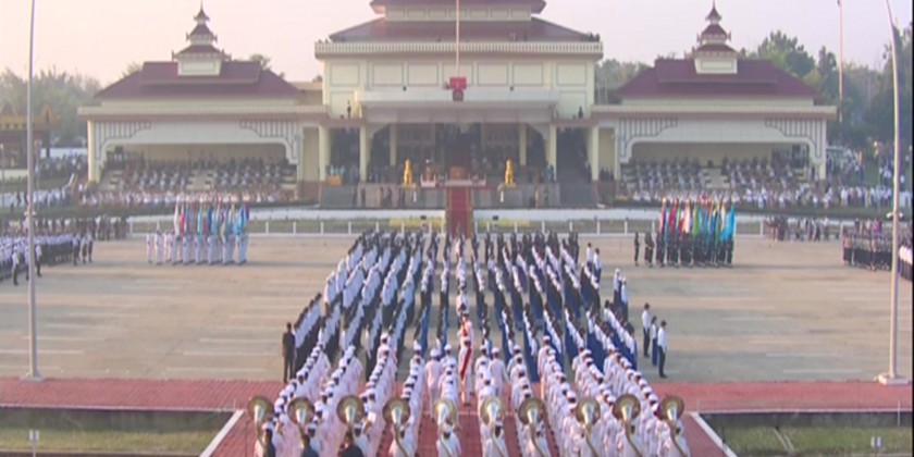 Next, the Prime Minister Senior General Min Aung Hlaing was marched pass and saluted by various parade columns of the defence services army, navy and air, military bands so also parade columns of Myanmar Police Force, red cross, fire brigade, government departments, representatives from regions and states, and choppers and fighter crafts from the defence services (air) hovered the air space in groups.