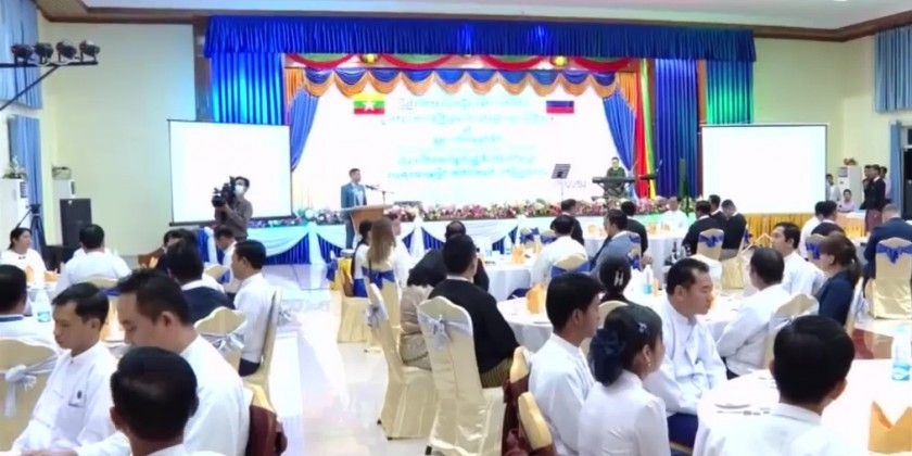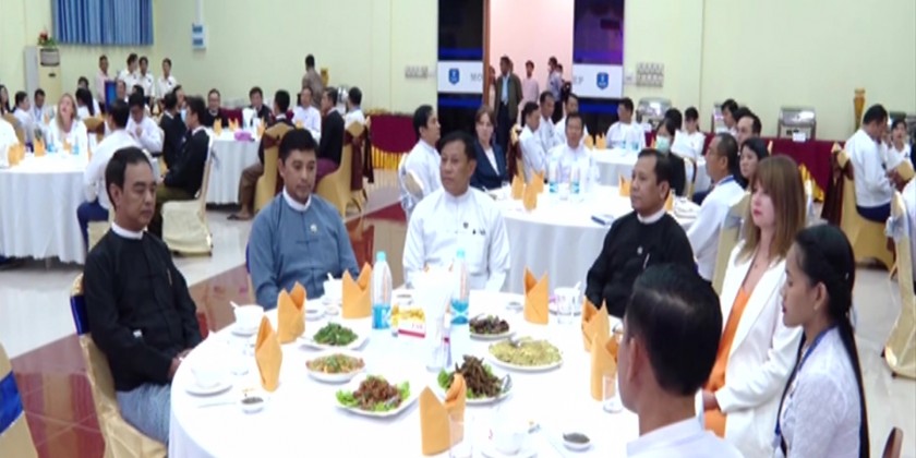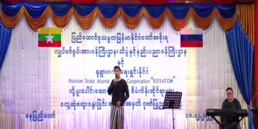 A dinner reception in honour of the cooperation project between the Ministry of Electric Power, the Ministry of Science and Technology and Russian State Atomic Energy Corporation “ROSATOM” under the program on implementation of Myanmar-Russia bilateral cooperation projects took place in Nay Pyi Taw on Sunday. Union Minister for Information U Maung Maung Ohn, Union Minister for Electric Power U Thaung Han, Union Minister for Energy U Myo Myint Oo, Union Minister for Science and Technology Dr Myo Thein Kyaw, Union Minister for Construction U Myo Thant, representatives from ROSATOM and officials attended the reception. Union Minister U Thaung Han and a representative from ROSATOM extended greetings. During the dinner, artists entertained the guests with songs.