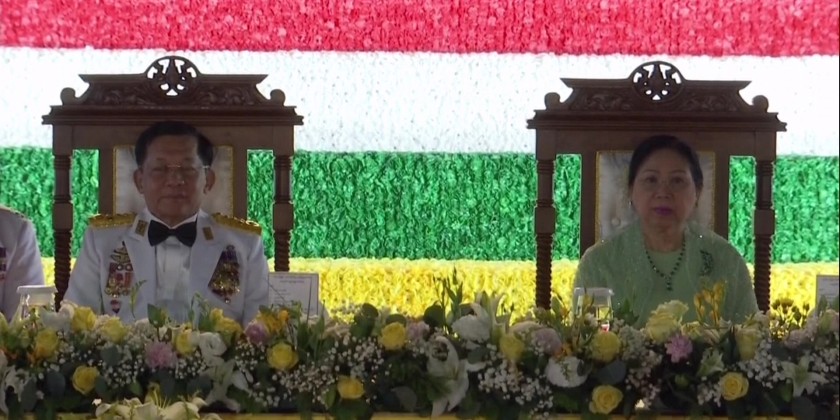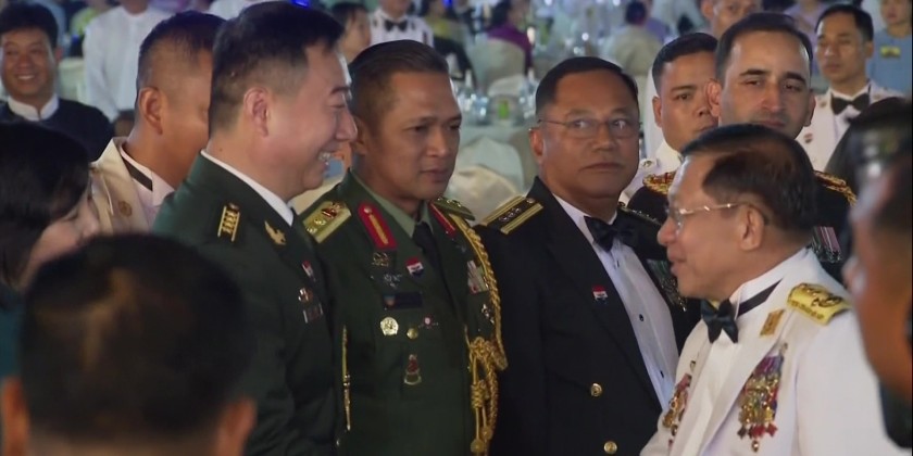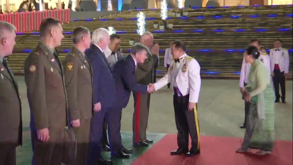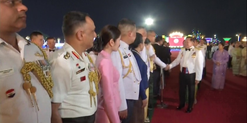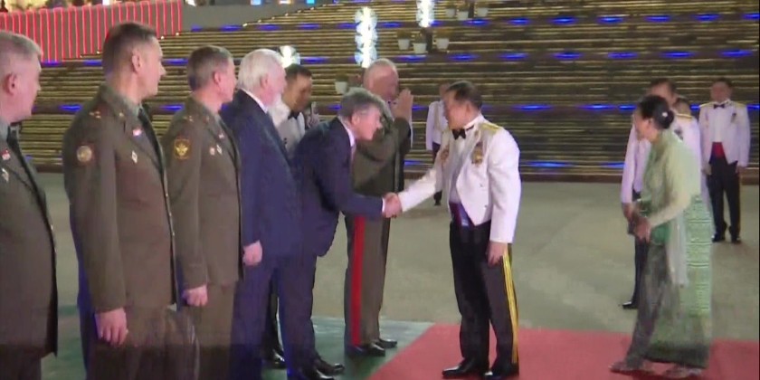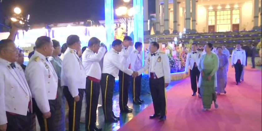 After the display of fireworks from the Parade Ground and the Bayintnaung Villa to commemorate the 80th anniversary Armed Forces Day, the Senior General and wife cordially greeted the attendees. Deputy Minister of Defence of Russian Federation Colonel General Alexander Vasilyevich Fomin also joined the dinner reception.