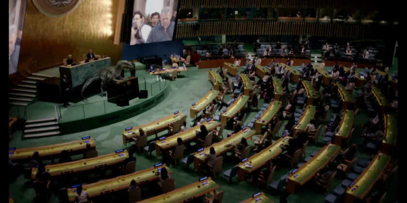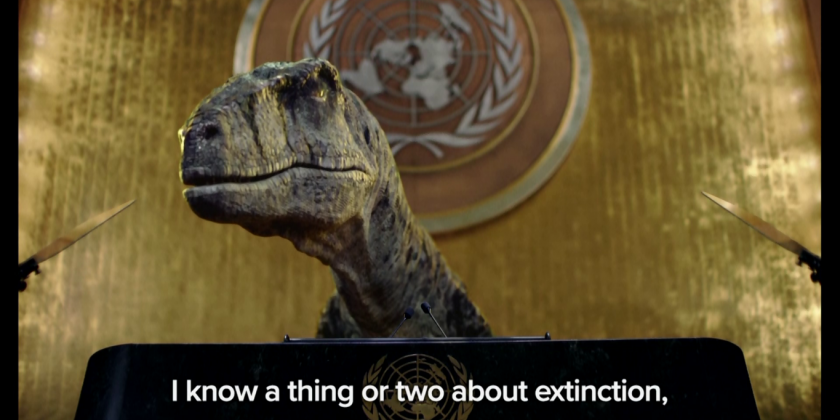A video of a dinosaur urging the United Nations General Assembly to act immediately to avoid 'extinction' at the hands of climate change was released Wednesday by the United Nations Development Program.