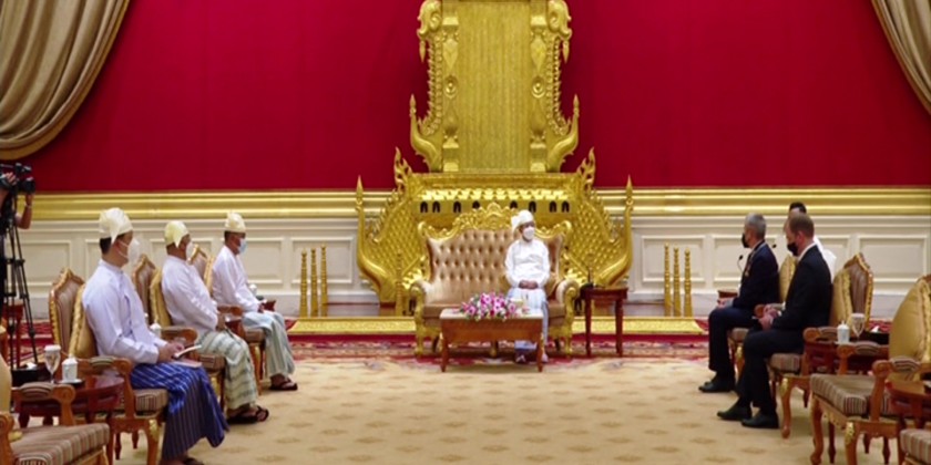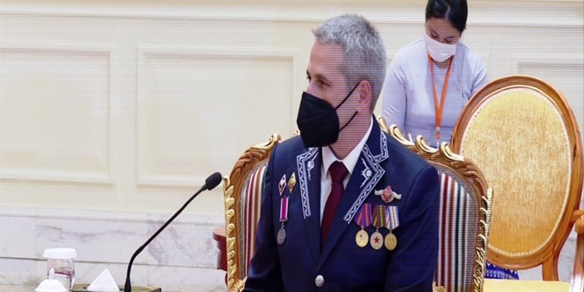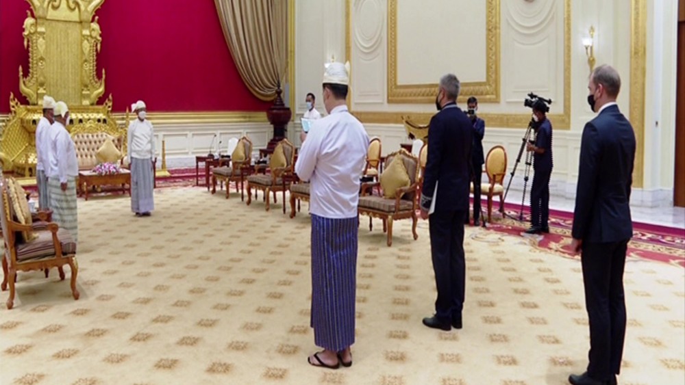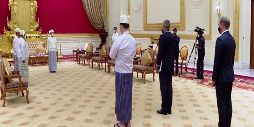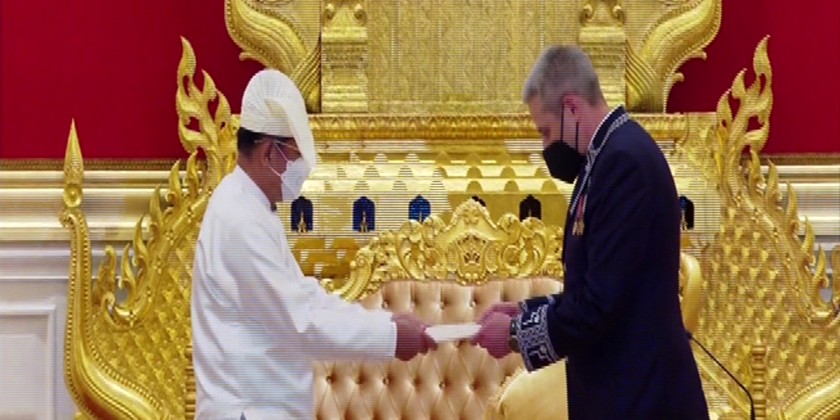 Chairman of the State Administration Council Prime Minister Senior General Min Aung Hlaing received the Credentials of the newly accredited Ambassador of Belarus to Myanmar Mr Uladzimir Baravikou in Nay Pyi Taw on Thursday. They also cordially discussed matters on bilateral diplomatic relations, reciprocal friendly visits, promoting cooperation in trading, science and technology and defence sector.