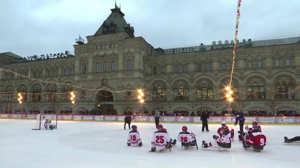 Russian children sledge hockey team played a friendly game with hockey veterans and celebrities on Sunday in the very heart of Moscow on Red Square ice rink.