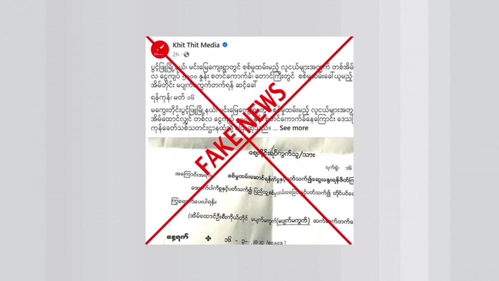 Similarly, one of a subversive destructive media outlets, Khit Thit, is spreading fake news, alleging that Tatmadaw is collecting 5,000 Kyats per house in MinMyay Village of PwintPhyu Township for military service. It is also fabricated news in order to cause misunderstanding among the public.