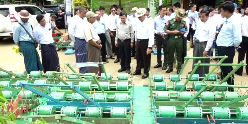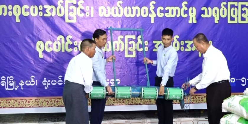 After that, Union Minister U Hla Moe, Nay Pyi Taw Council Chairman U Than Tun Oo, and Deputy Minister U Myint Soe presented agricultural supplies including seeders, paddy and cotton seeds, and inputs worth 2.28 billion for over 10,000 acres of cooperative farmland. They also observed agricultural machinery such as plowing machines, harvesters, and seeders being demonstrated, and inspected the cooperative sales and services being provided to farmers.
