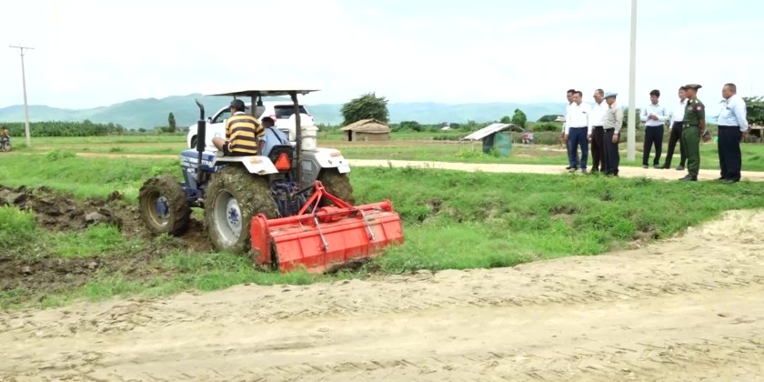 Union Minister for Cooperatives and Rural Development U Hla Moe gave a speech at the ceremony for the distribution of seeds and agricultural inputs, demonstrations of cooperative agricultural services, and collective plowing activities, jointly organized by Myanmar Agricultural Development Bank under the Department of Cooperatives,, seed production companies, input supply companies, and agricultural machinery sales companies, held in Yone-Pin-Zaung Village, Zeyathiri Township, Nay Pyi Taw Council Area, on May 28.