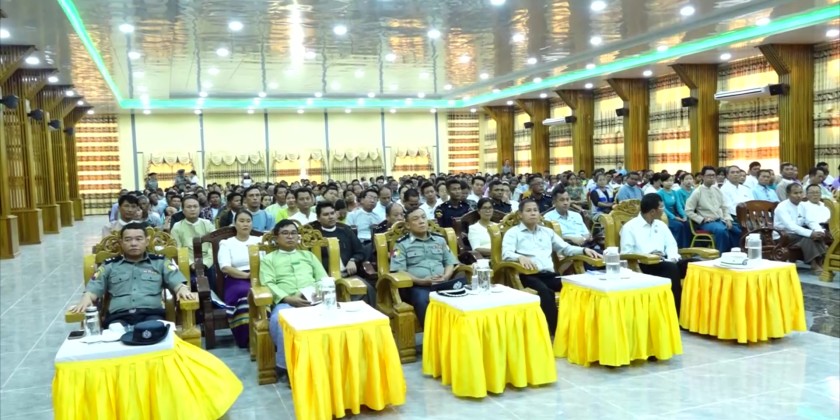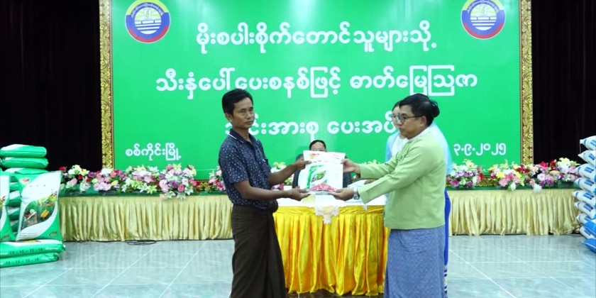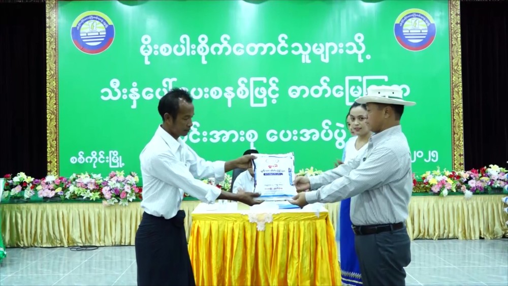 Union Minister for Cooperatives and Rural Development U Hla Moe and officials attended the event for the distribution of fertilizers on a crop-yield-based system to monsoon paddy farmers not covered by the State Economic Promotion Fund in Sagaing on 3rd September.