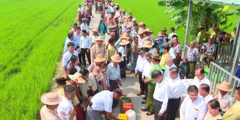 Following his speech, the Chief Minister and officials inspected the distribution process. For the 750 remaining acres of summer paddy land preparation in Amarapura District for the 2025-2026 season, 750 gallons of locally produced diesel were sold directly to farmers at the subsidized rate of 10,000 Kyats per gallon.