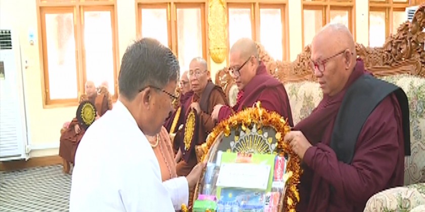 Next, Union Minister, deputy minister and officials offered the Waso robes and offertories to the Sayadaws. Then, officials donated 40 softcopies of Tripitaka (Pali) and soft copies, 100 sets of Pahtan treatise books donated by Letpadaung saydaw and Tripitaka (Pali) and dictionary treatise books to the Ministry of Religious and Culture and the Union Minister received the donations.