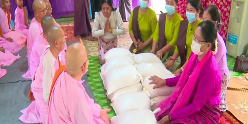 The Member of the State Administration Council Daw Aye Nu Sein, accompanied by the chairperson and members of the Rakhine State Maternal and Child Welfare Association Supervisory Committee, donated rice bags to nunneries in Sittway.