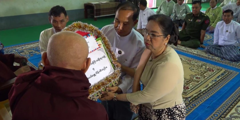 First, the Region Chief Minister and the guests received the Five Precepts from the Presiding Sayadawgyi of the Ah-Shay Lay Htat Monastery Monastery in Monywa.