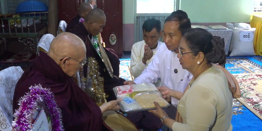 Following this, the Region Chief Minister and his wife, along with members of the Region Government and their wives, offered rice, oil, salt, beans, medicine, and other donated items to the Sayadawgyis and members of Sangha. The Region Chief Minister then presented matters concerning religious affairs.