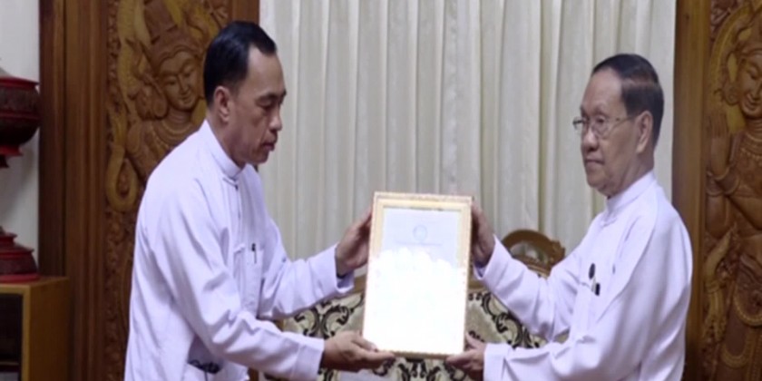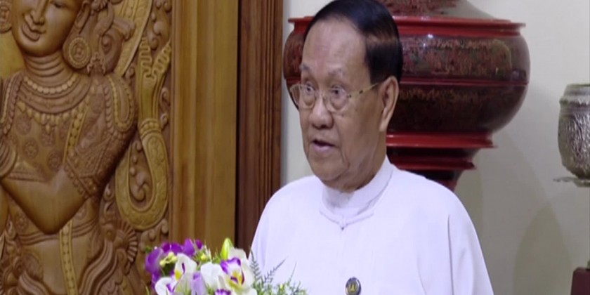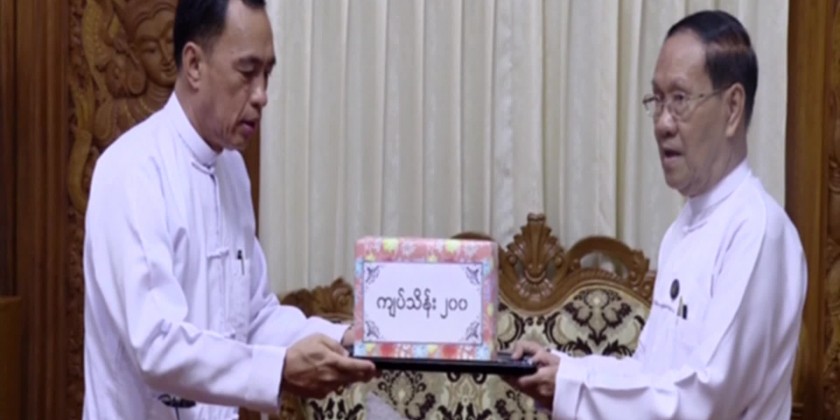 A cash donation ceremony of LING JIOU MOUNTAIN (H.K) BUDDHIST SOCIETY LIMITED and WHITE JADE WANG INTERPRISE CO.,LTD to the Ministry of Religious Affairs and Culture  for rehabilitation works of religious buildings in cyclone hit areas was held at the Ministry in Nay Pyi Taw on Monday.