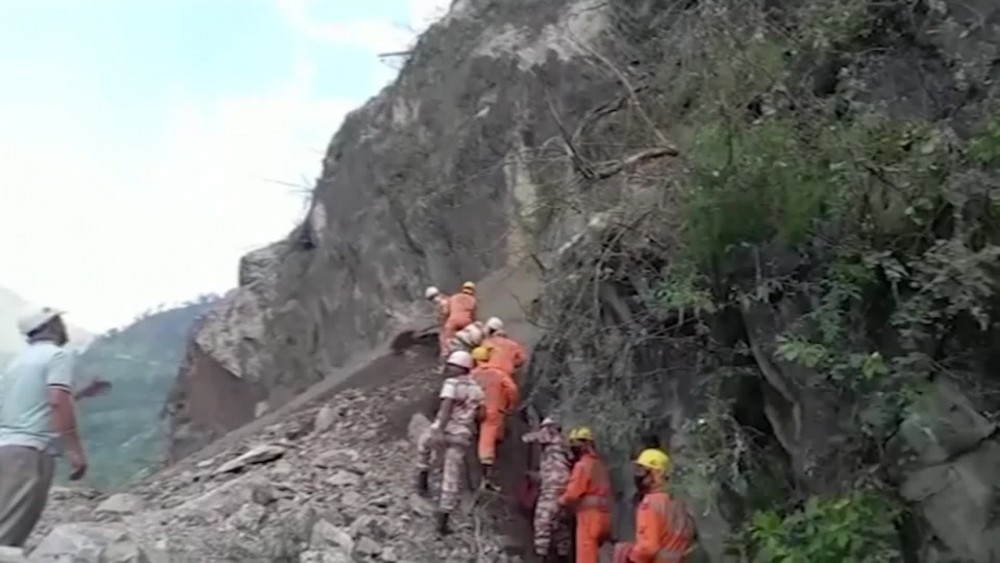 A bus, a truck and a few other vehicles were buried under mud and rocks following the landslide in Himachal Pradesh state's Kinnaur district. Official said up to 50 people were feared trapped and seven had been rescued and taken to the hospital. Heavy rain has caused several landslides in parts of Himachal Pradesh state over the past few weeks. The region is 600 kilometers north of New Delhi.