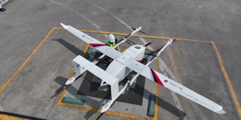 Every day from 10:30 in Guangdong’s tech hub of Shenzhen City, drones take to the skies from Qianhai to deliver parcels to neighboring cities Zhongshan and Zhuhai.